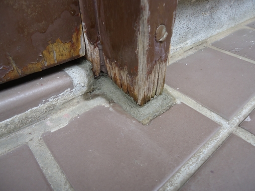 玄関ドア枠の根元が腐食しタイル目地に隙間ができています。